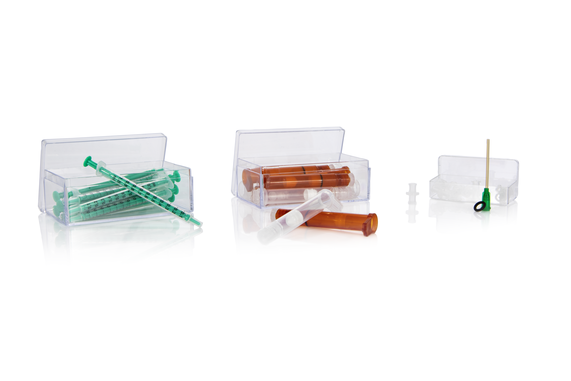 The SP52 dosing set equips the Liquid Needle dosing system of your instrument for reliable dispensing of the standard test liquids: water and diiodomethane. The cartridges can be filled quickly and easily using the included disposable syringes and Luer connectors. The diiodomethane cartridges are additionally protected against leakage with a safety foil. One SP52 disposable dosing set is included in the scope of delivery of the MSA One-Click SFE or the Liquid Needle dosing system.