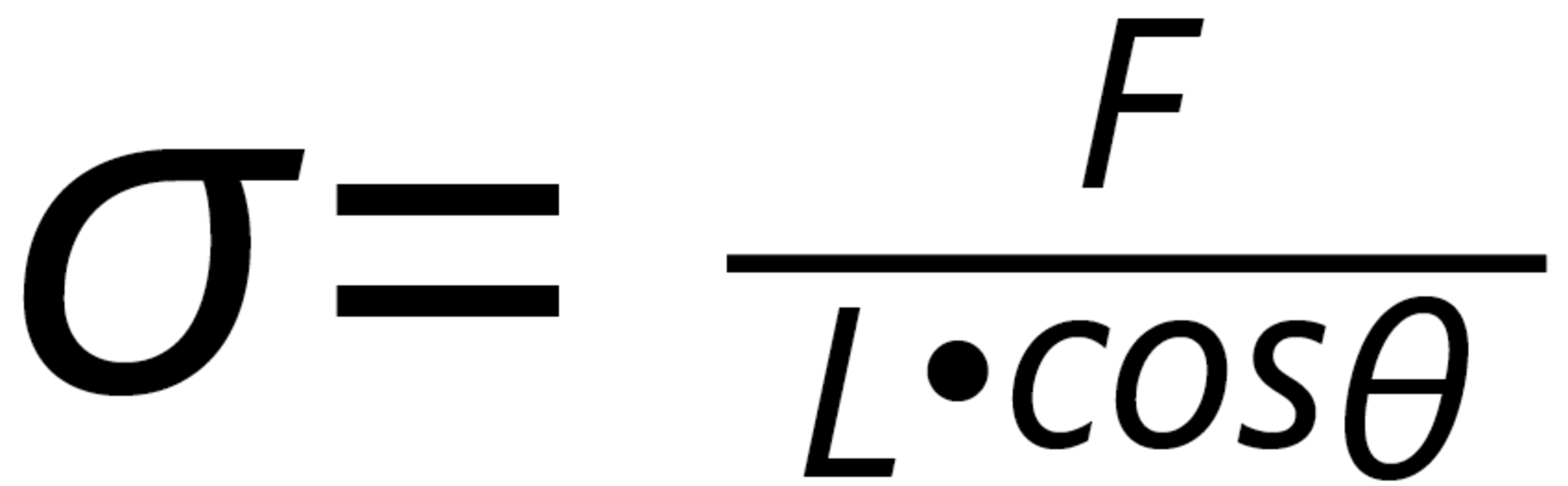 A force maximum Fmax occurs when the lamella, which is produced when the ring moves through the phase boundary, is aligned vertically to the ring plane. This maximum correlates with the surface tension σ or interfacial tension according to the following equation: